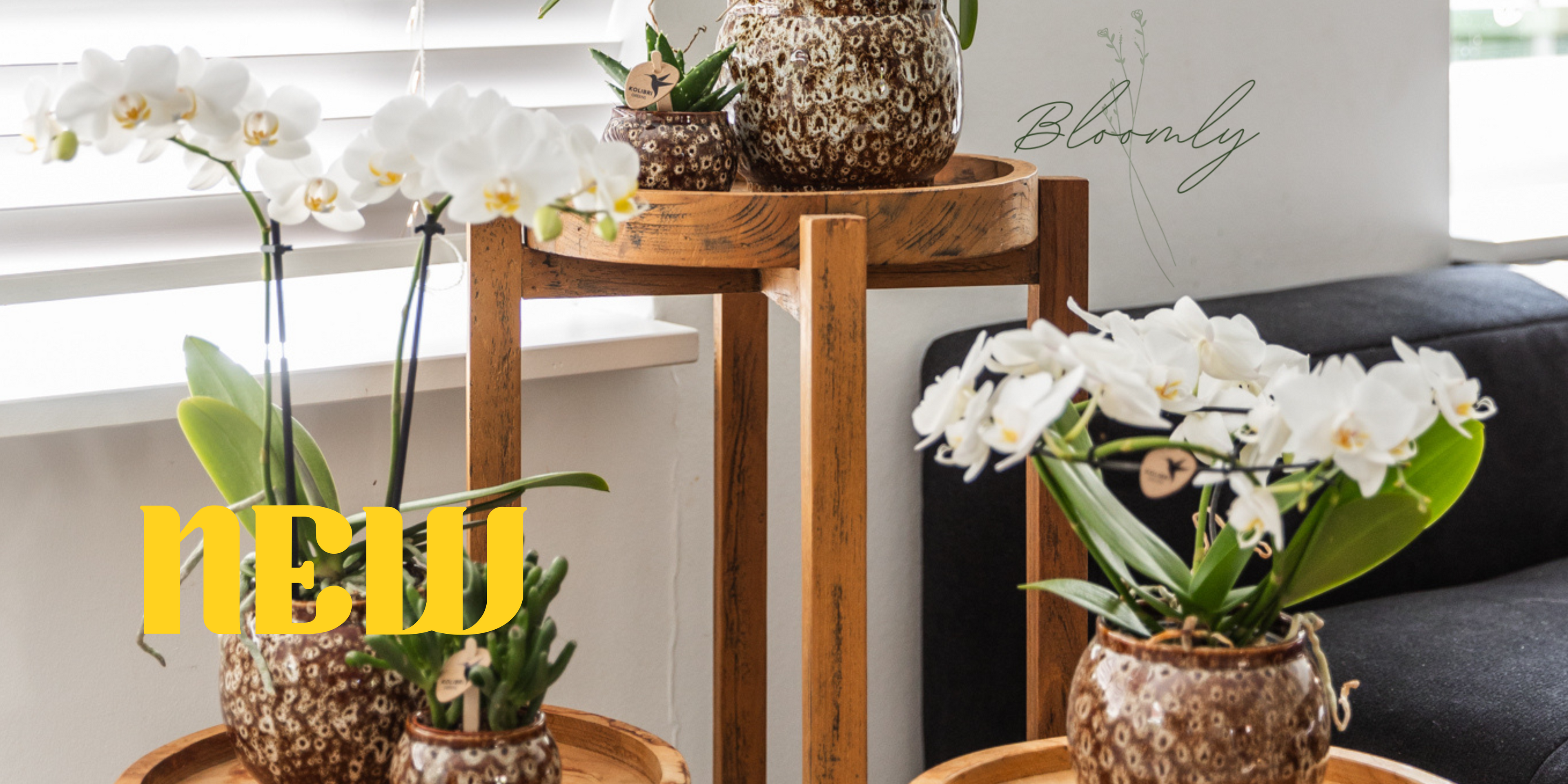 Kolibri Orchids | Gift Set Slow Living | Piante verdi con orchidea Phalaenopsis bianca Lausanne in vasi beige su vassoio bianco