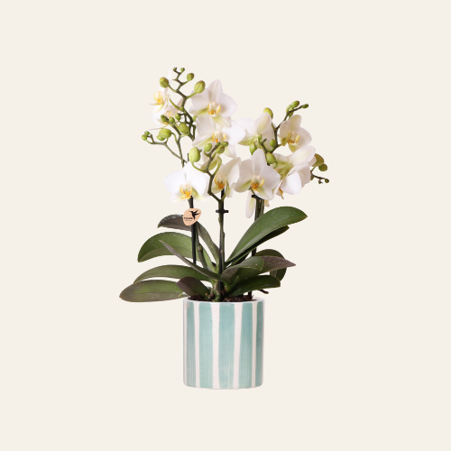 Kolibri Orchids | Set regalo Small | Pianta verde con orchidea Phalaenopsis gialla in vasi decorativi Painted Stripe su vassoio organico bianco
